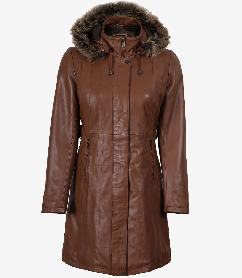 Women’s Brown Leather Long Coat With Faux Fur Hood