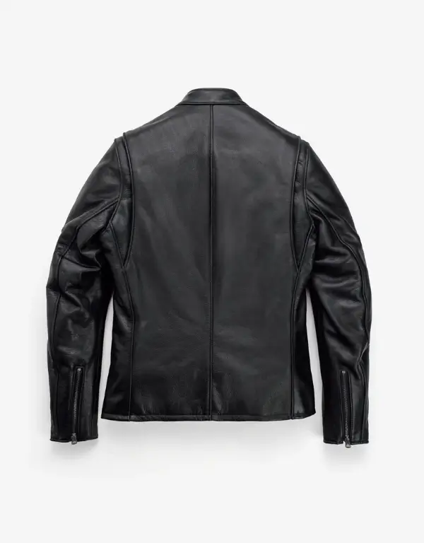 - Collar Style: Stand-up mandarin café racer collar with snap tab