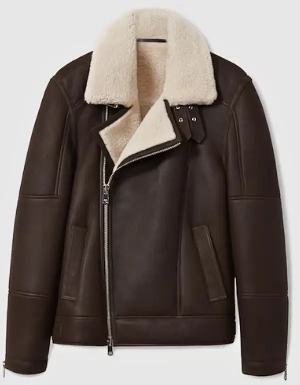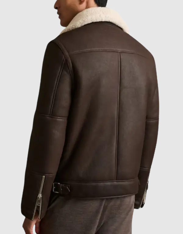 The shearling-lined spread collar with double buckle strap adds a bold aviator look while allowing extra protection against the cold. A two-way front zipper, buckle-strap side adjusters, and zipped cuffs ensure a secure, adjustable fit. Finished in a rich dark brown color, this jacket pairs effortlessly with casual or semi-formal outfits, making it a must-have winter essential.
